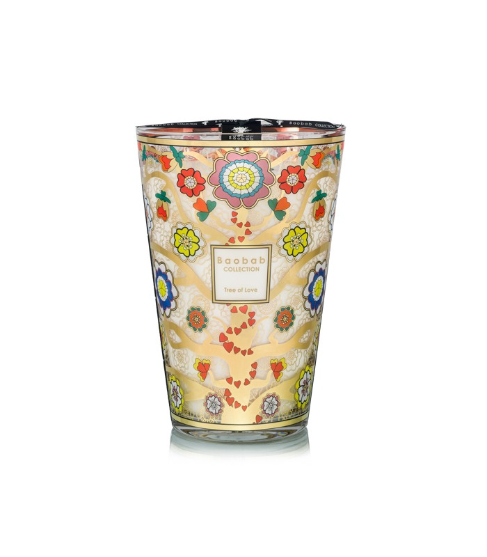 BAOBAB COLLECTIONBOUGIES PARFUMÉESTREE OF LOVE La bougie parfumée Tree of Love se distingue par son élégante sérigraphie dorée et multicolore, inspirée de l’iconographie des arbres de vie. Ses branches dorées sont ornées d’une profusion de fleurs dont les pétales en forme de cœur s’entrelacent.